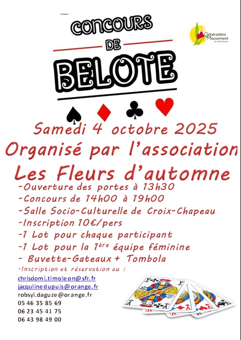 CONCOURS DE BELOTE LE SAMEDI 4 OCTOBREPar Emmanuel ROUSSILLE / 23 septembre 2025 Facebook Twitter LinkedIn Email Imprimer
