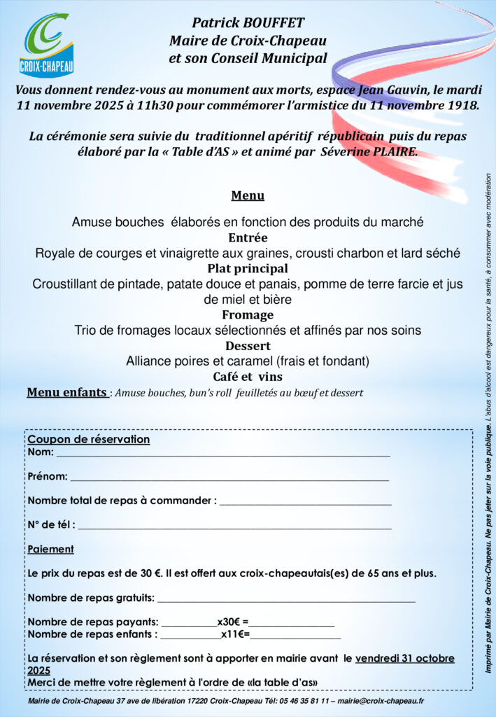 Menu du 11 novembre 2025Par Emmanuel ROUSSILLE / 16 octobre 2025 𝐕𝐨𝐮𝐬 𝐩𝐨𝐮𝐯𝐞𝐳 𝐯𝐨𝐮𝐬 𝐢𝐧𝐬𝐜𝐫𝐢𝐫𝐞 𝐩𝐨𝐮𝐫 𝐥𝐞 𝐭𝐫𝐚𝐝𝐢𝐭𝐢𝐨𝐧𝐧𝐞𝐥 𝐫𝐞𝐩𝐚𝐬 𝐝𝐮 𝟏𝟏 𝐧𝐨𝐯𝐞𝐦𝐛𝐫𝐞 𝐞𝐧 𝐭𝐞́𝐥𝐞́𝐜𝐡𝐚𝐫𝐠𝐞𝐚𝐧𝐭 𝐥𝐞 𝐟𝐚𝐢𝐫𝐞 𝐩𝐚𝐫𝐭 𝐜𝐢-𝐝𝐞𝐬𝐬𝐨𝐮𝐬. Facebook Twitter LinkedIn Email Imprimer